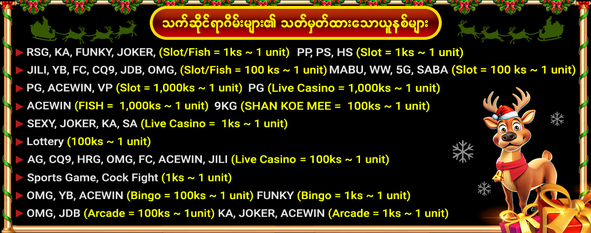 2. Slot ဂိမ္းအားလုံးတြက္ခ်က္ေပးပါသည္။(YGG ၊ ACE WIN မပါဝင္ပါ)အႏိုင္ရရွိေသာဆုမ်ားကို ႀကိမ္ေရတစ္ဆကစားၿပီးမွသာလွ်င္ေငြထုတ္ႏိုင္မည္။