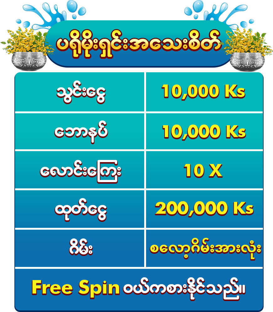 ❄️ ႀကိမ္ေရ 10 ဆ ကစားၿပီး ထုတ္ေငြ 200,000 Ks အထိထုတ္ယူႏိုင္သည္။